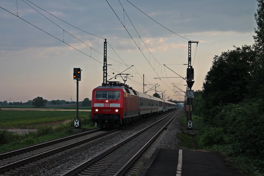 120 135-9 am Morgen des 25.07.2013 mit dem CNL 458 (Prag hl.n. - Zürich HB) / CNL 1258 (Berlin-Lichtenberg - Zürich HB) / IC 60458 (Frankfurt Süd - Basel SBB) bei der Durchfahrt des Hp. Auggen gen Schweiz.