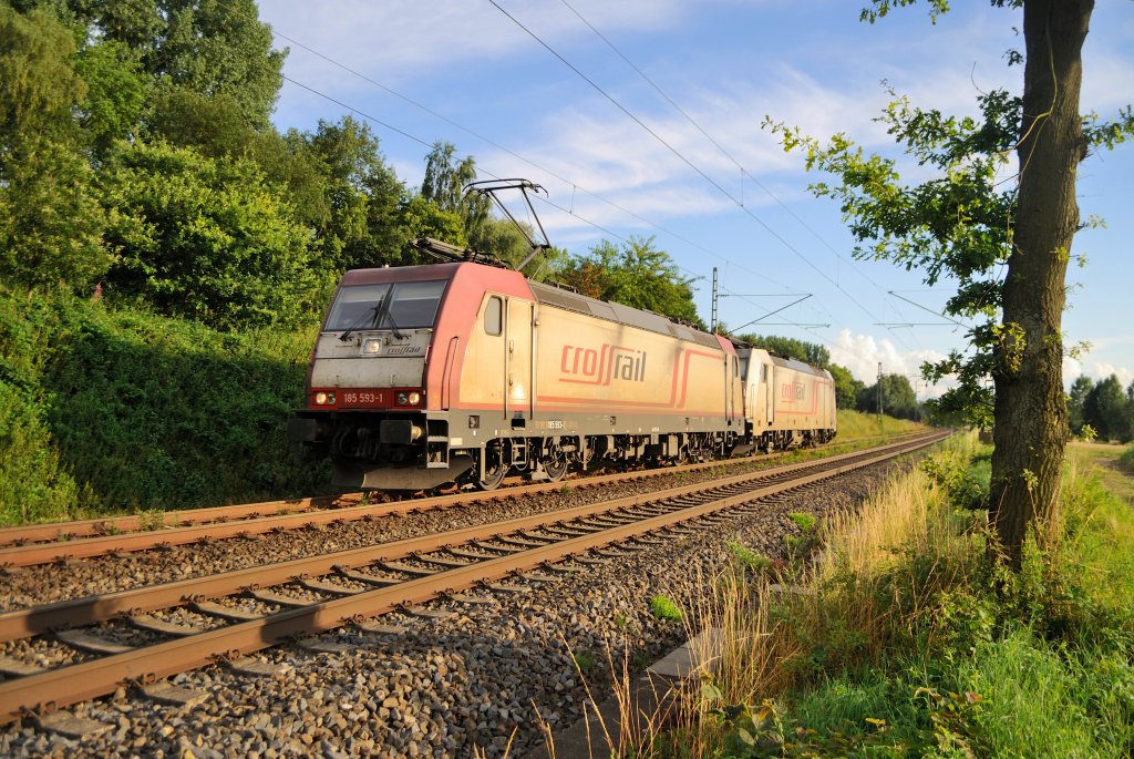CrossRais 185 593-1 mit einer Schwesterlok´, am Abend des 28.7.2013 im Wurmtal auf der KBS 485 bei Km 20,8 von Aachen kommend unterwegs.