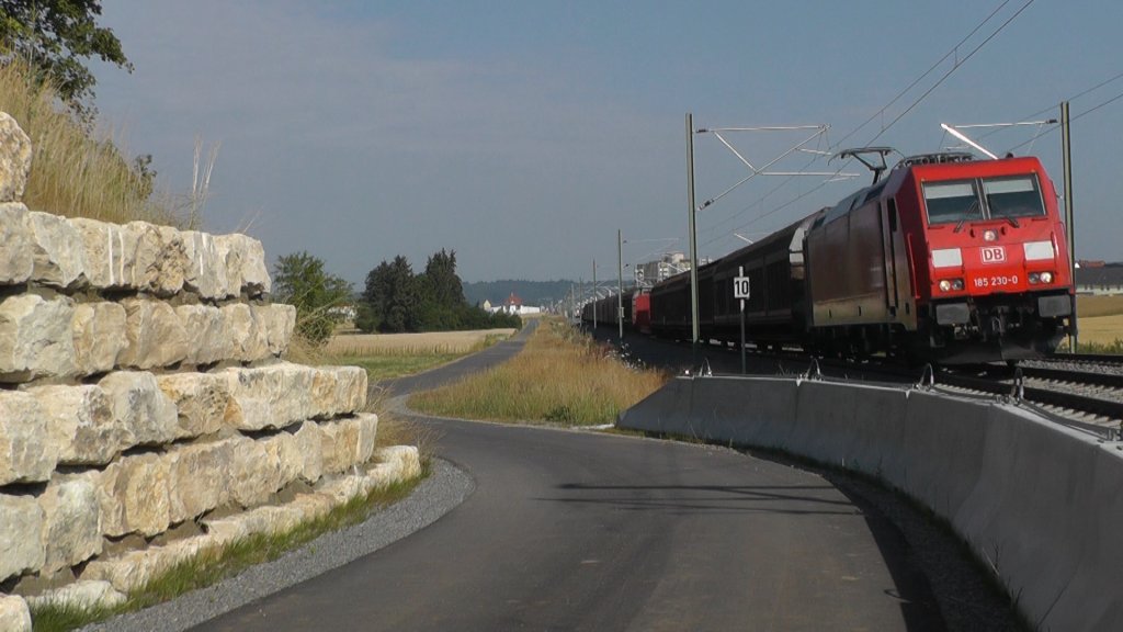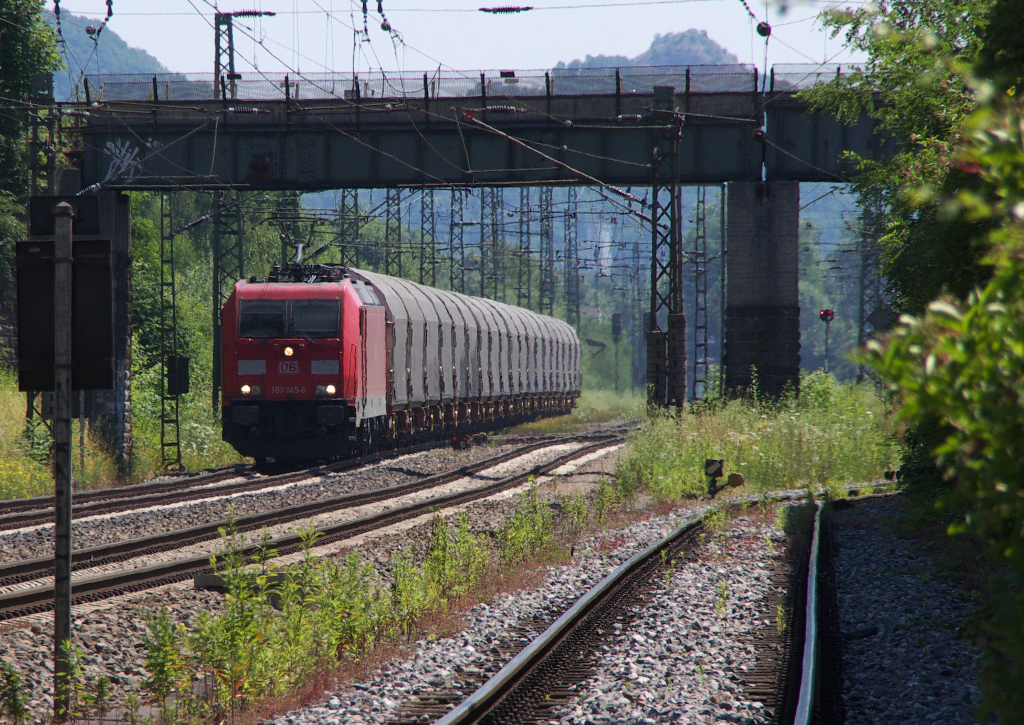 In der brütenden Mittagssonne...lockte mich 185 345 aus meinem schattigen Plätzchen an der KBS 685 hervor. Sie befördert hier einen Ganzzug aus ÖBB Wagen nach Dillingen/Saar.
