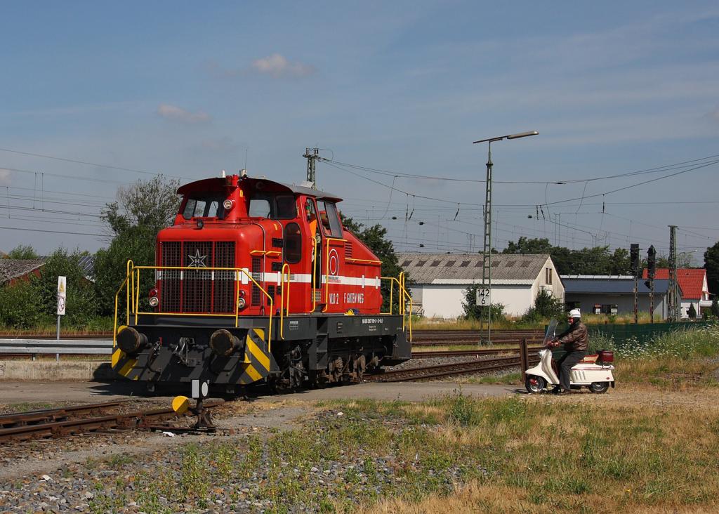 einen Zug abzuholen. Roller und Lokomotive dürfte aus einer Epoche stammen!