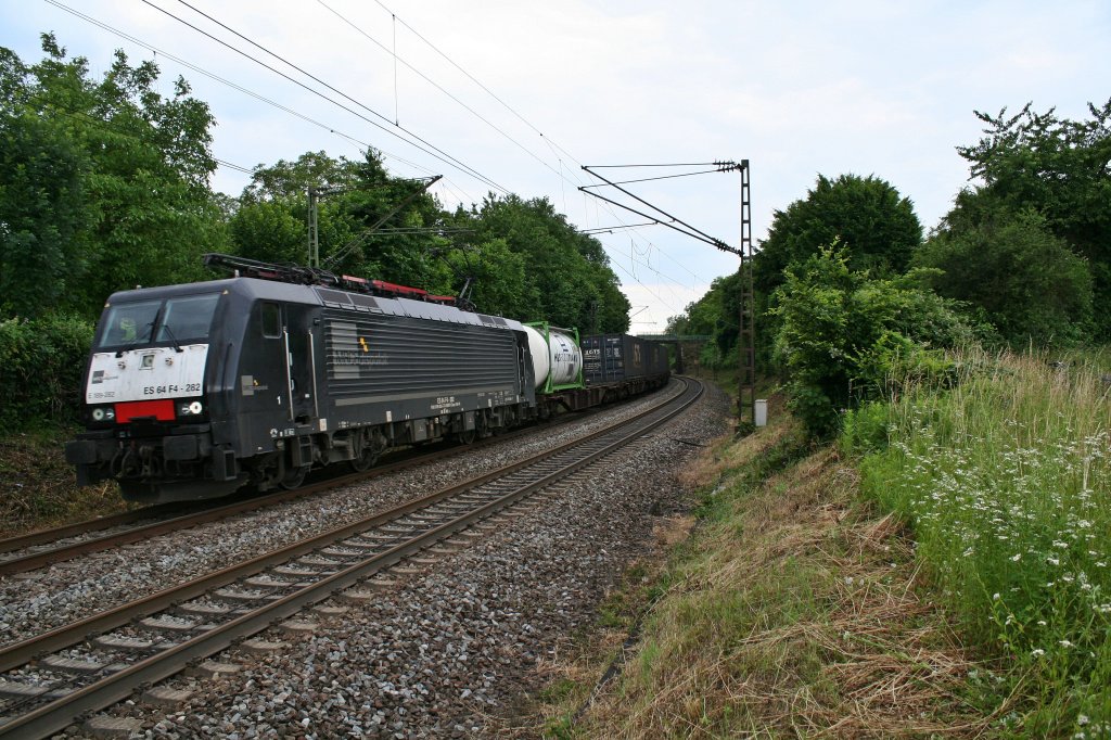 185 174-0 mit einem KLV-Zug am 25.06.13 bei der Durchfahrt der Schallstadter Südkurve kurz vor dem gleichnamigen Haltepunkt gen Norden.