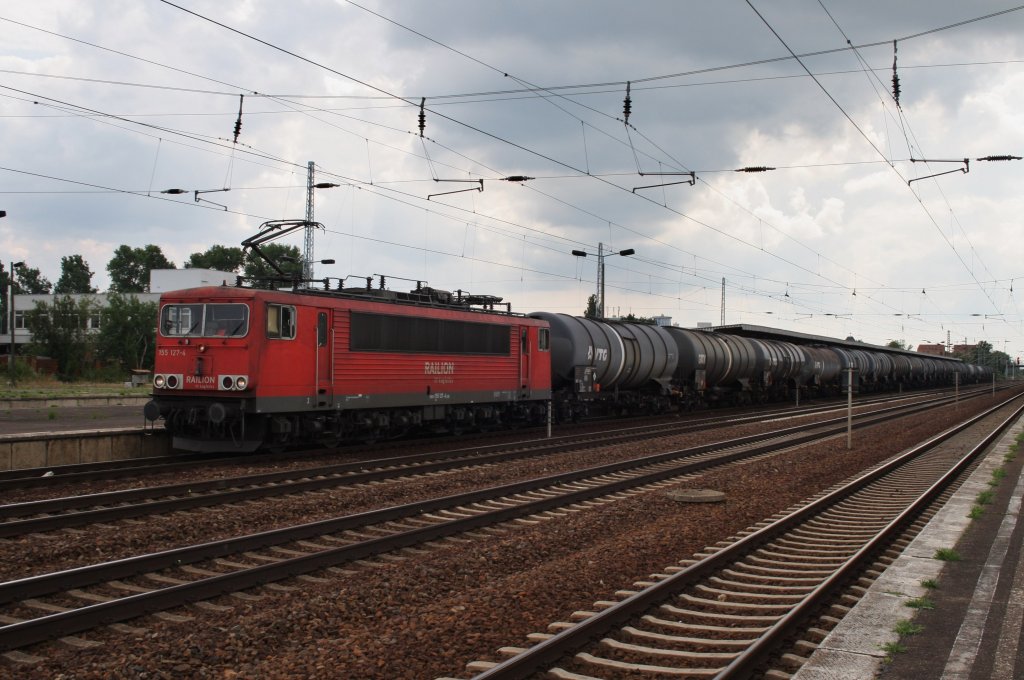 Hier 155 127-4 mit einem Kesselwagenzug, bei der Durchfahrt am 28.6.2013 durch Berlin Schönefeld Flughafen, in Richutng Berlin Grünauer Kreuz.