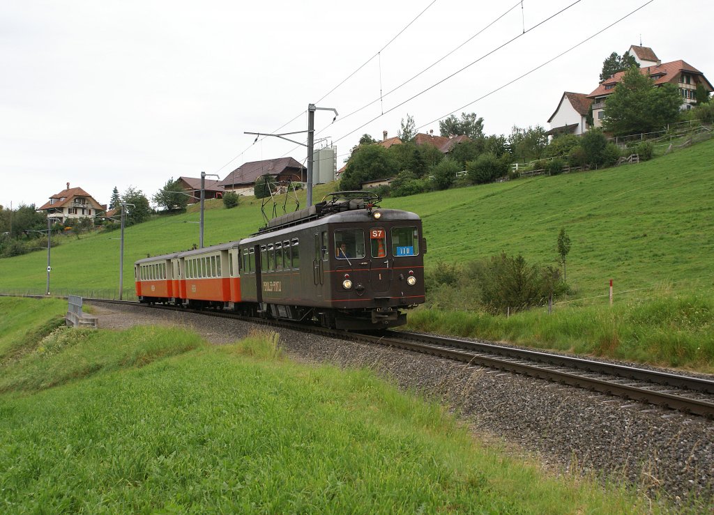 RBS: Trotz Neuanschaffung und Modernisierung von Rollmaterial sind im Fuhrpark der RBS noch einige ältere Fahrzeuge erhalten geblieben. Bre 4/4 1 mit einem Sonderzug bei Vechigen am 21. August 2009.