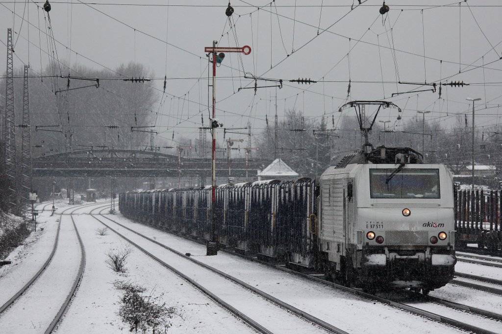 Akiem/TWE E37 511 zog am 6.2.13 einen Röhrenzug durch Düsseldorf-Rath.