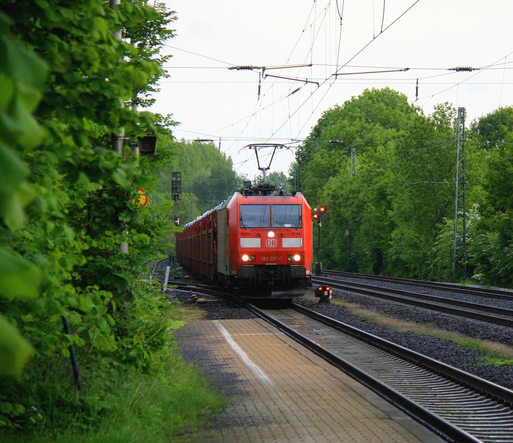 185 197-1 DB kommt aus Richtung Aachen-West und fährt durch Kohlscheid mit einem sehr langen Toyota-Autozug aus Zeebrugge-Ramskapelle(B) nach Mszczonow(PL) und fährt in Richtung Herzogenrath,Neuss bei Sonne und Regenwolken am 25.5.2013.