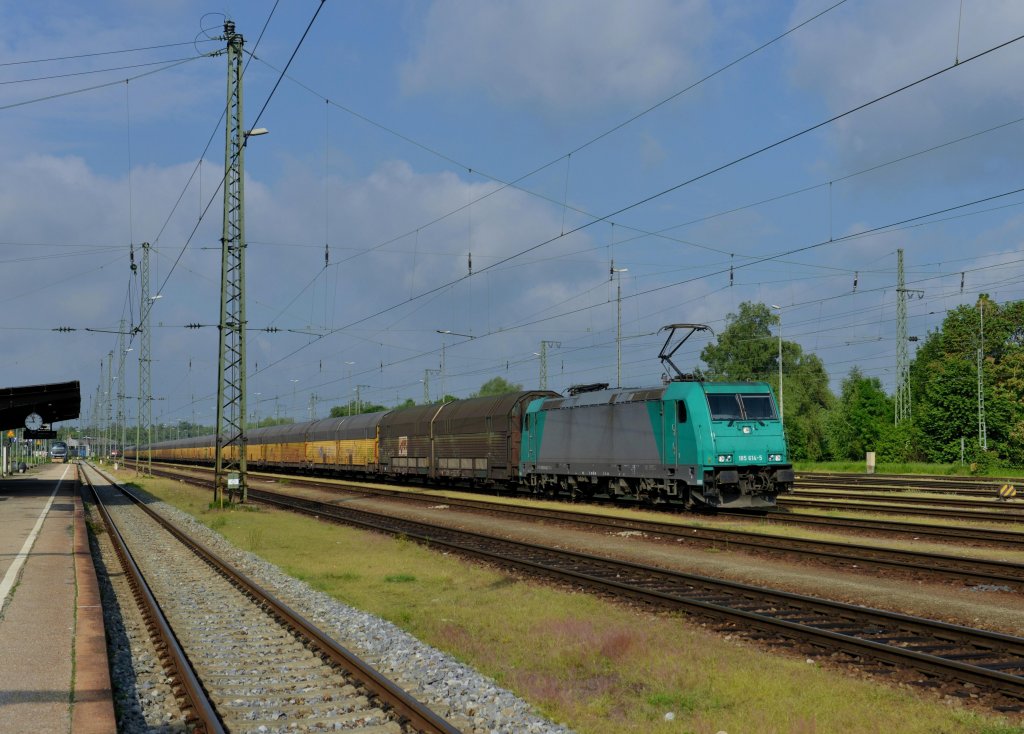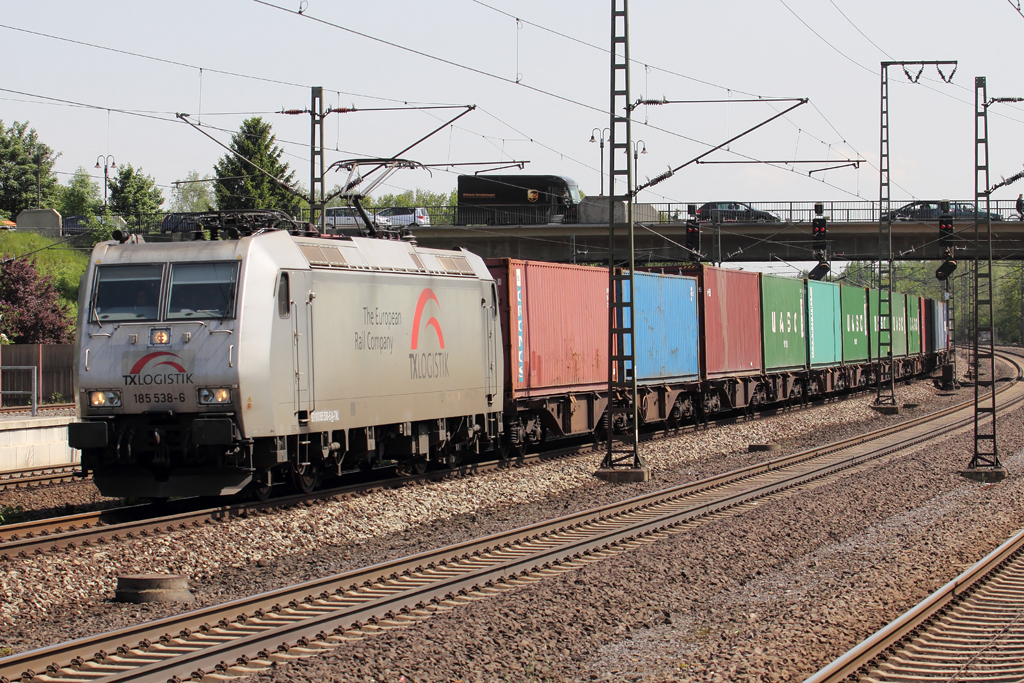 185 197-1 DB kommt aus Richtung Aachen-West und fährt durch Kohlscheid mit einem  sehr langen Toyota-Autozug aus Zeebrugge-Ramskapelle(B) nach Mszczonow(PL)  und fährt in Richtung Herzogenrath,Neuss bei Sonne und Regenwolken am 25.5.2013.