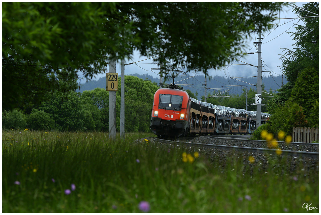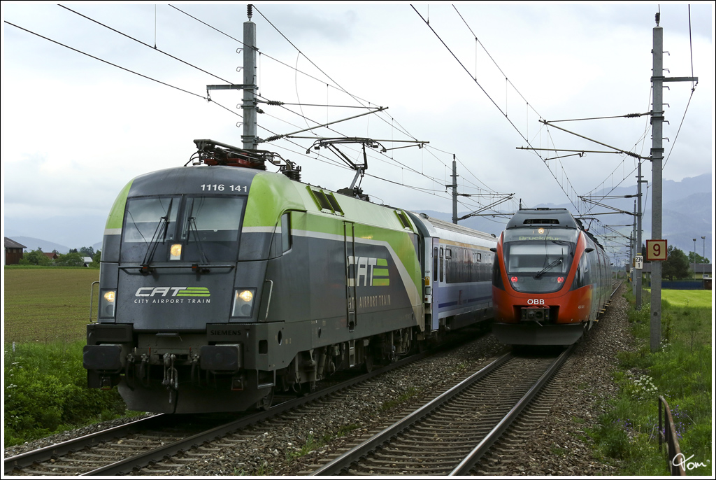 CAT 1116 141 zieht den EC 103 Polonia in Richtung Villach, während im Vordergrund 4024 040 in Richtung Bruck an der Mur rollt.