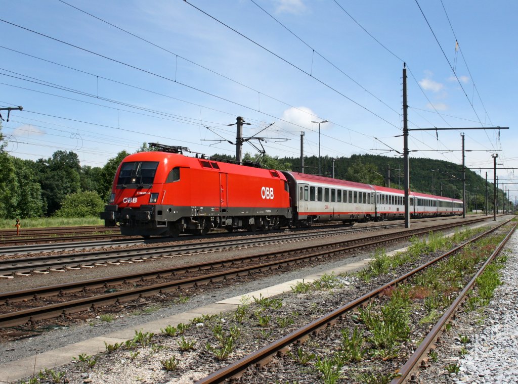 Die 1116 231 mit einem OIC nach Salzburg am 31.05.2009 bei der Durchfahrt in Timelkam.