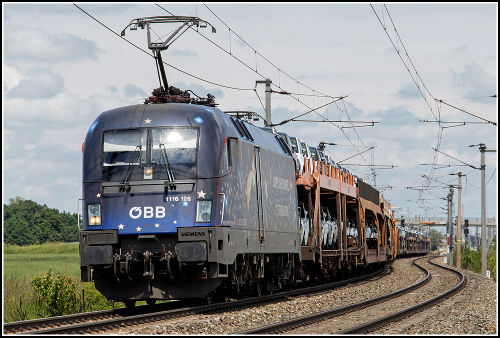 Die bekannte Fotostelle kurz nach Wampersdorf ausnahmsweiße aus einem anderen Blickwinkel: 1116 126 schlängelt sich am 01. Juni 2013 mit ihrem GAG 46385 (Breclav - Tarvisio Boscoverde) kurz nach Wampersdorf in Richtung Ebenfurth entlang.
