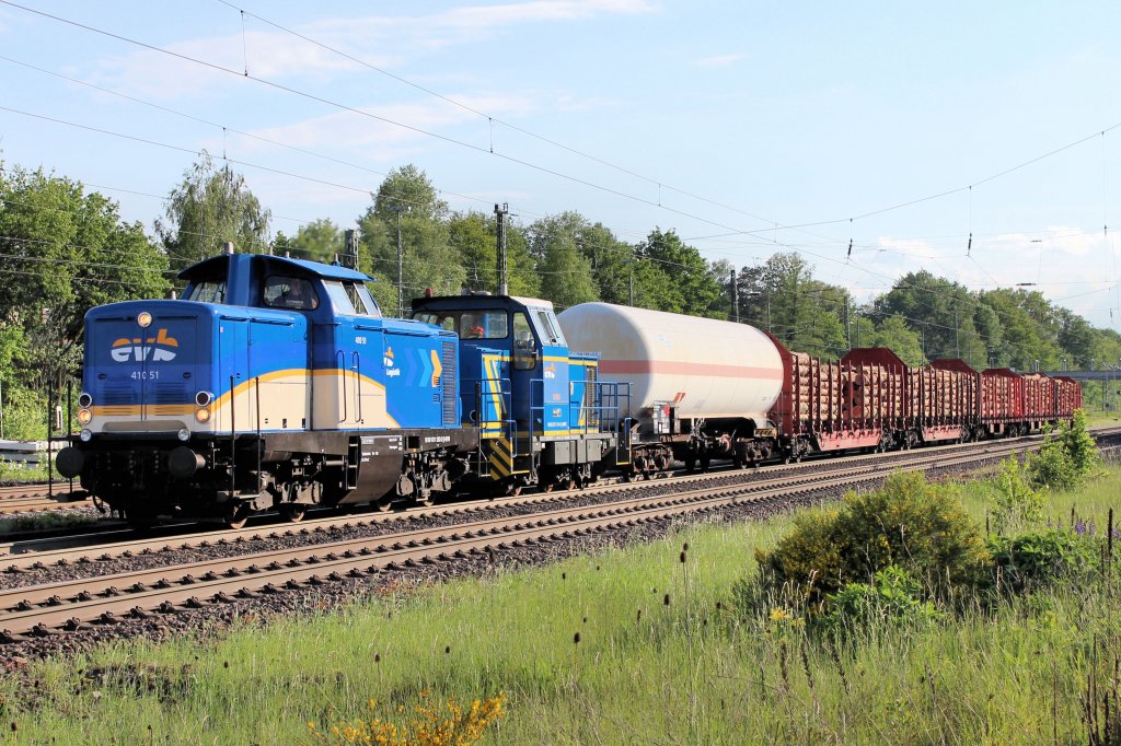 evb Logistik 410 51 mit evb V 761 und einen Übergabezug am Haken sind auf den Weg nach Hamburg. Tostedt den 31.05.2013