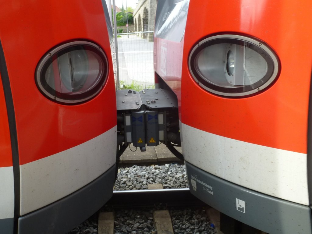 Hier sieht man die Kupplung zwischen zwei 423ern, aufgenommen im S-Bahnhof München Hackerbrücke, 23.Mai 2013.