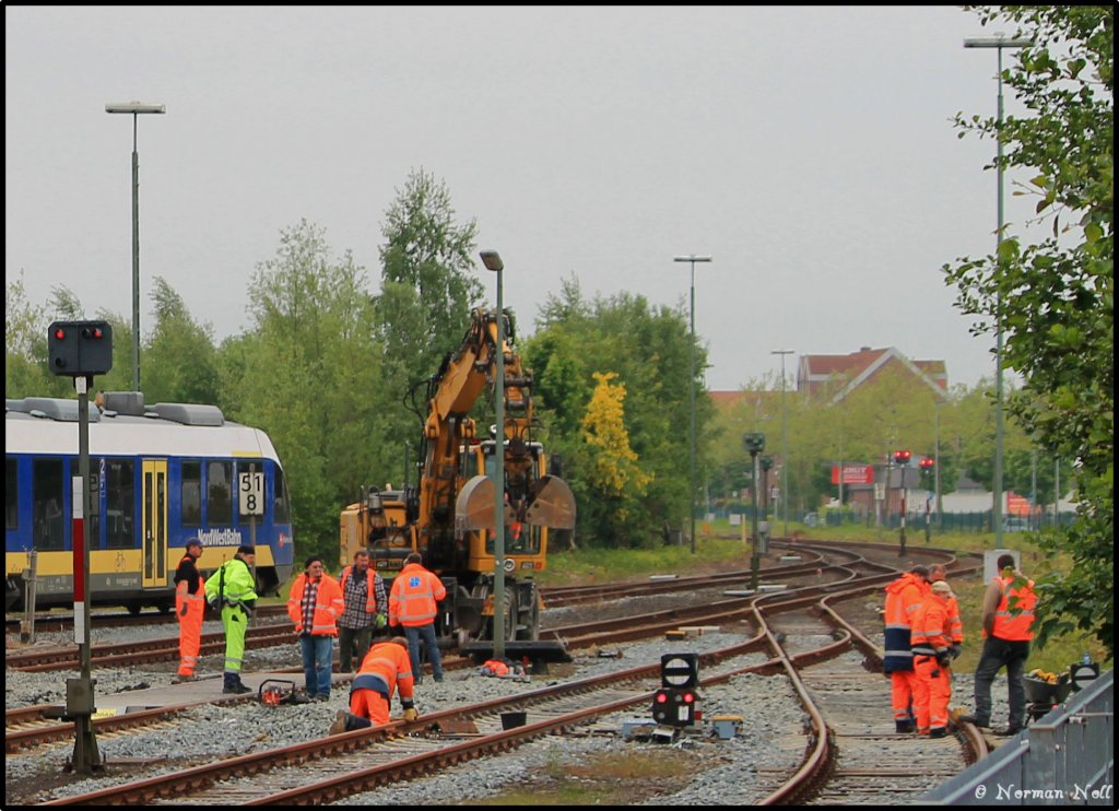 Komplett Sanierung des fünf Gleisigen Bahnübergangs in Bahnhof Wilhelmshaven mittels tausch der Schwellen und dem einbringen von Gleiseindeckungssystemen.Zu sehen sind ein Stopfexpress sowie ein Schotterflug der Firma Spitzke sowie eine einfahrende doppeltraktion Lint 41 der Nord-West-Bahn. 01/06/2013