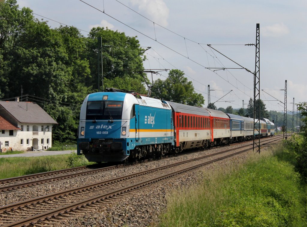 Die 183 003 mit einem ALEX nach München am 08.06.2013 unterwegs bei Moosburg.