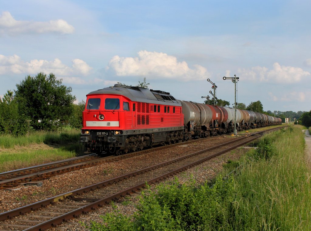 Die 232 117 mit einem Kesselzug am 07.06.2013 bei der Ausfahrt aus Tüßling.