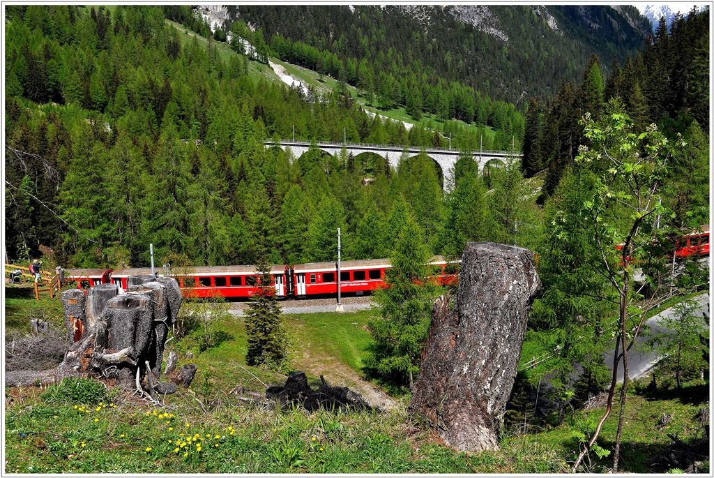 RE1133 mit einer Ge 4/4 II fährt oberhalb von Muot bergwärts Richtung Preda. (12.06.2013)
