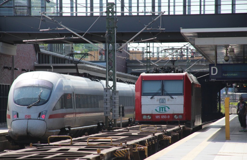 17.6.2013 Berlin-Gesundbrunnen. ICE nach München und ITL 185-650 mit Containerzug