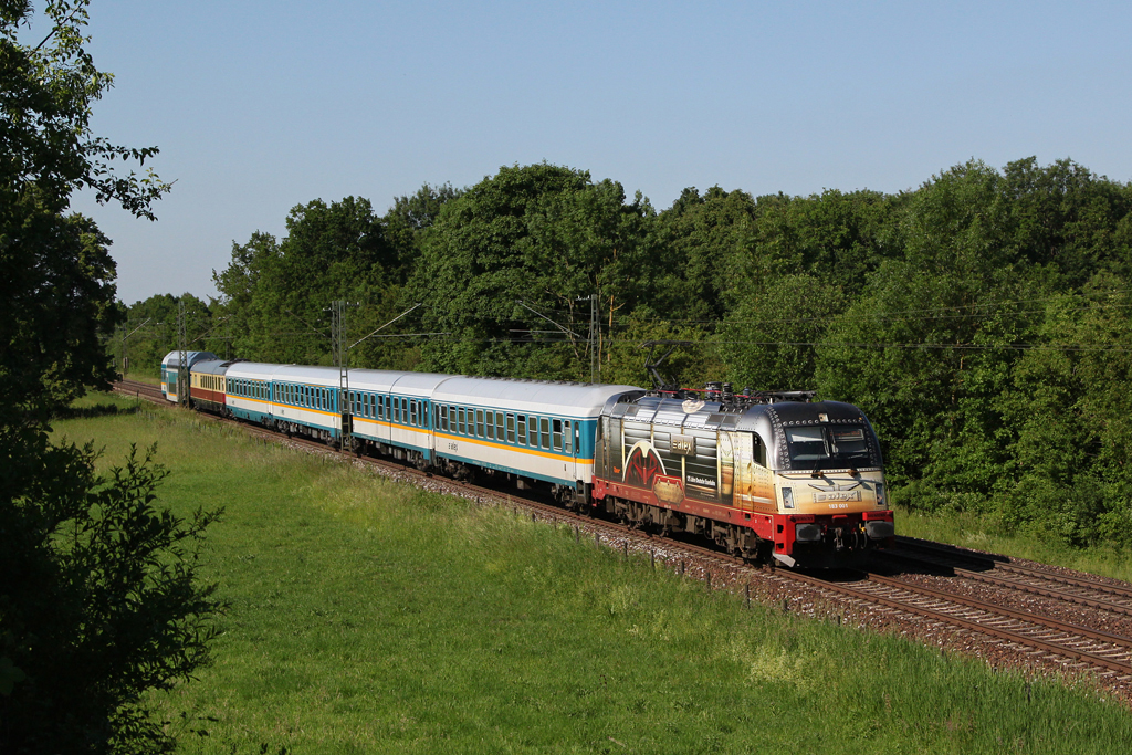 101 131 mit einem IC mit ehemaligen "Metropolitan" Wagen, hier zusehen am 16.06.13 in Unterloquitz.