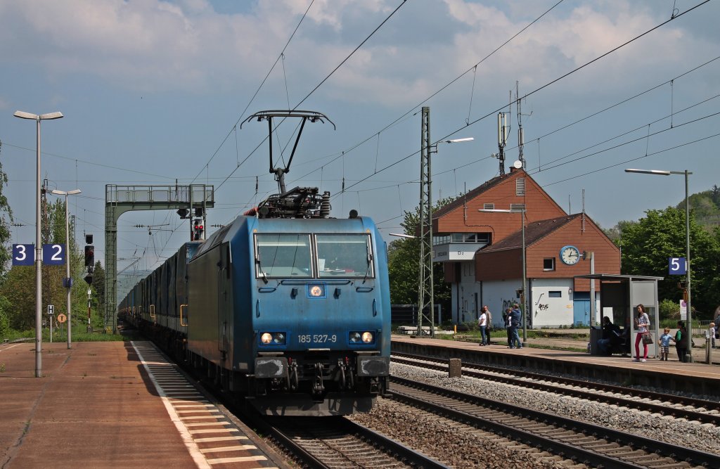 185 527-9 von Crossrail am 05.05.2013 mit dem LKW Walter KLV auf dem Weg von Aachen West in Richtung Schweiz. Hier ist der Containerzug bei der Durchfahrt auf der KBS 703 in Denzlingen.