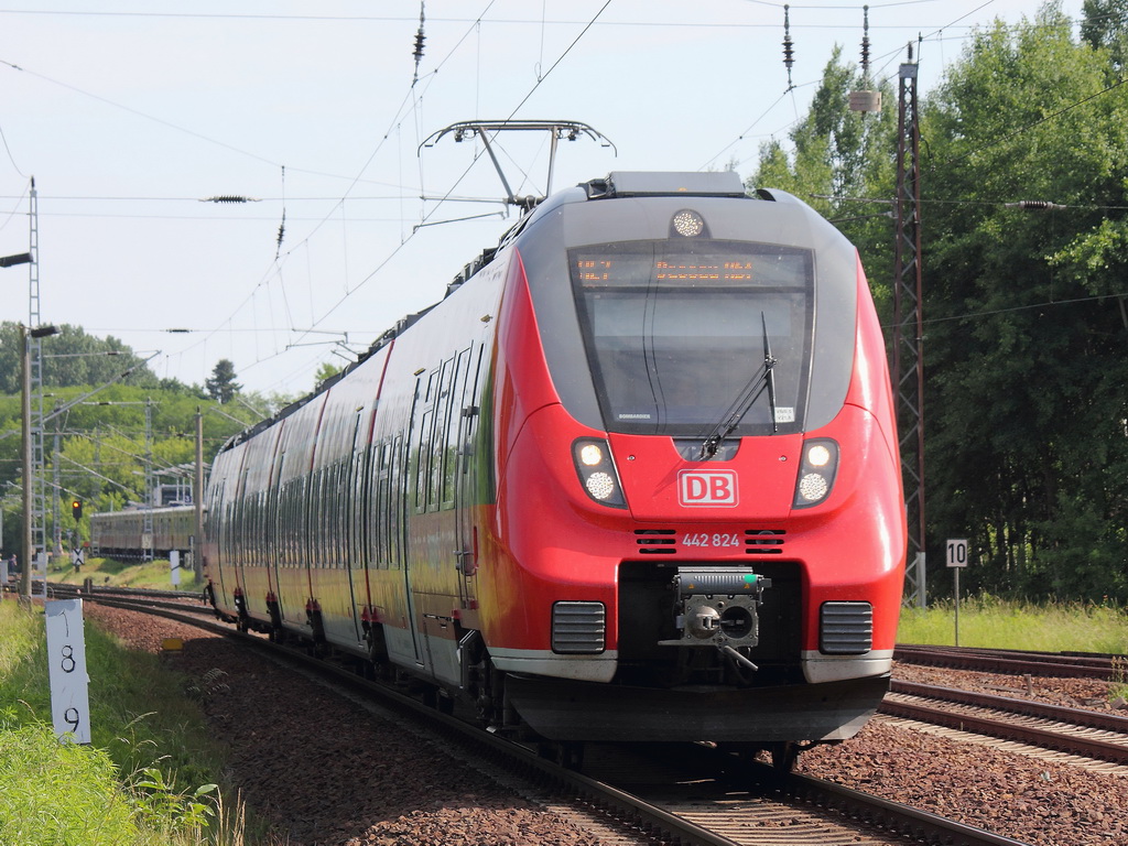 442 824 mit 442 324 am 17. Juni 2013 am Bahnübergang Tunnelweg in Blankenfelde (Brandenburg) als RE 7 nach Dessau. Gruß an den Tf!