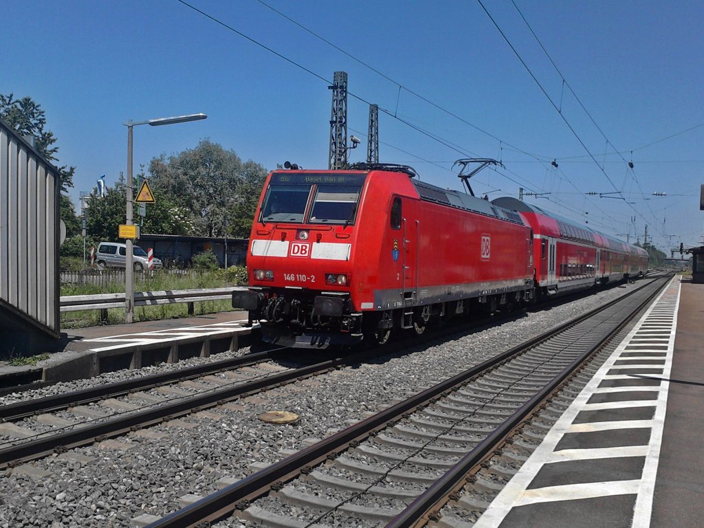 Am 28.05.2012 stand 146 110-2 "Müllheim (Baden)", noch ohne Sietenwerbung, mit einem RE aus Offenburg nach Basel Bad Bf in dem Bahnhof in Orschweier und wartet, dass alle Passagiere ein- und ausgestiegen sind.