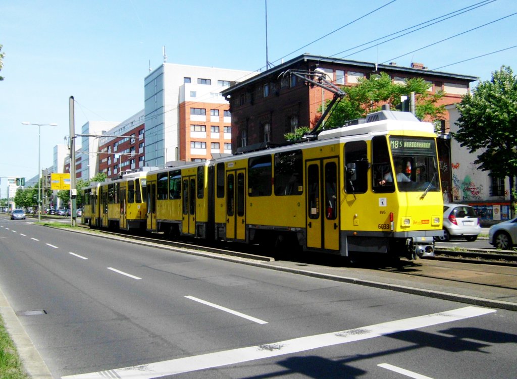 Berlin: Straßenbahnlinie M8 nach S-Bahnhof Nordbahnhof an der Haltestelle Friedrichshain Landsberger Allee/Petersburger Straße.(17.6.2013)