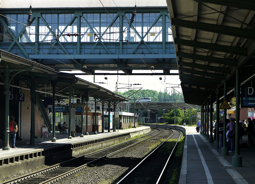Blick Richtung Süden auf Bahnsteig 1 und den Inselbahnsteig in Hamburg-Harburg. 9.6.2013