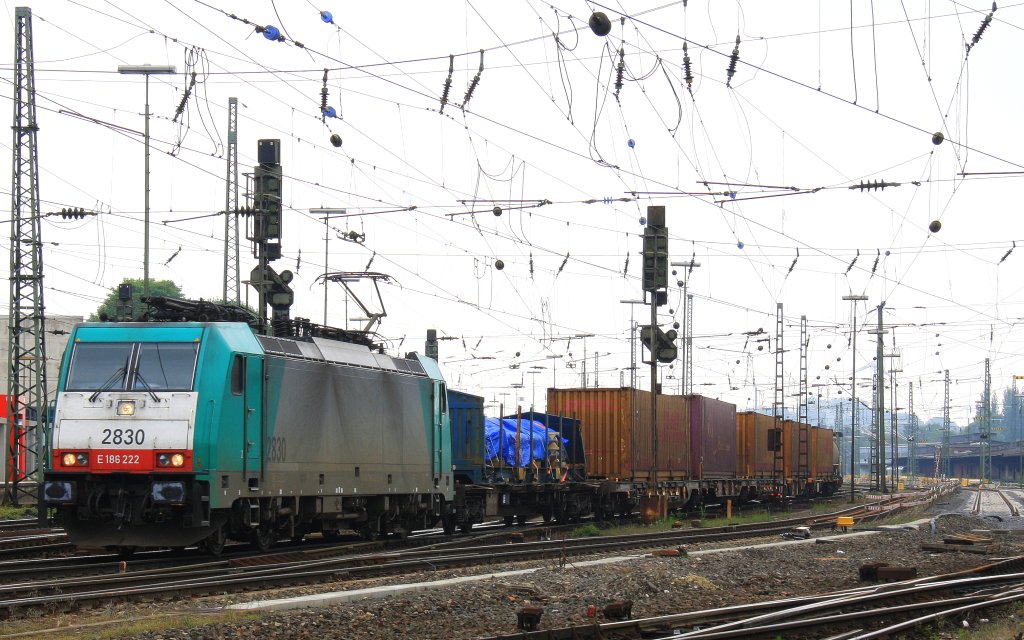 Die Cobra 2830 fährt mit einem langen Containerzug aus Gallarate(I) nach Zeebrugge(B) bei der Ausfahrt aus Aachen-West und fährt in Richtung Montzen/Belgien bei Sonne und Wolken am 1.6.2013.