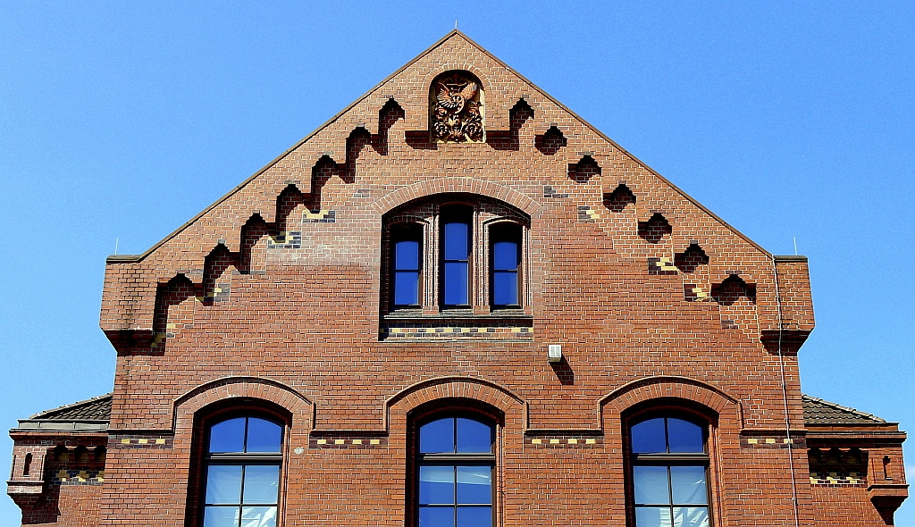 Etwas schlichter, aber auch schön: Giebel des Bahnhofsgebäudes auf dem Inselbahnsteig in Hamburg-Harburg. 9.6.2013
