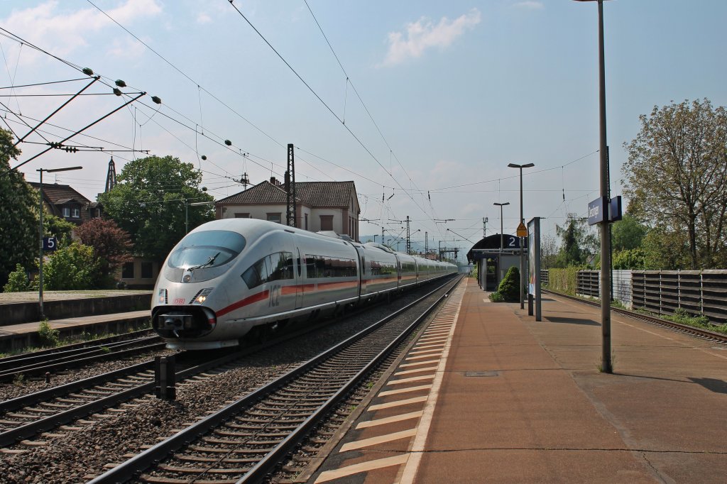 Hier ist die Doppeleinheit, die aus 403 036-7 "Ingolstadt" und 403 509-3 "Aalen" bestehen, bei der Durchfahrt gen Norden durch Denzlingen. (05.05.2013)