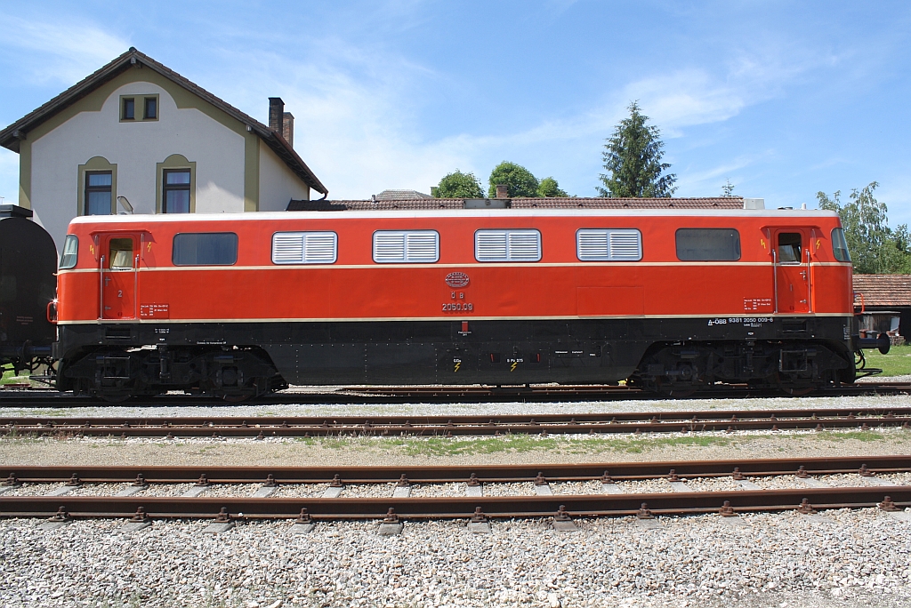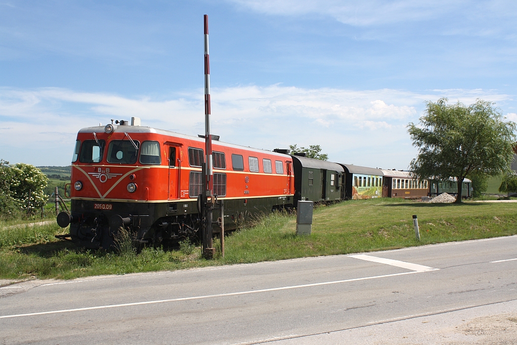 ÖBB 2050.09 wartet am 15.Juni 2013 mit dem Nostalgie-Express Leiser Berge vor dem Bf. Wetzleinsdorf bis das Zugbegleitpersonal den Schranken geschlossen hat.