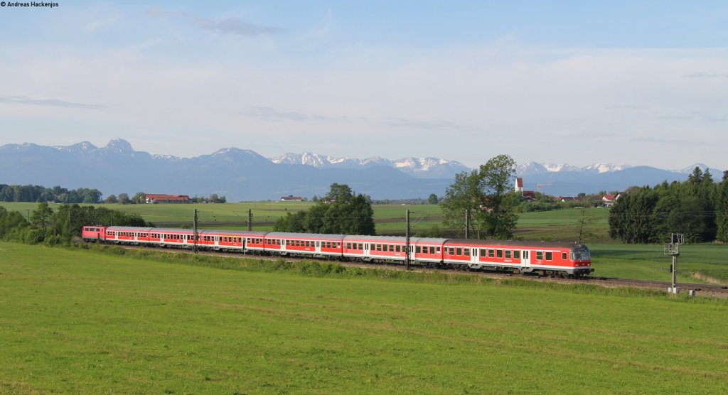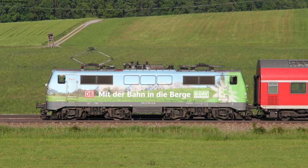 RE 79008 (Salzburg Hbf-München Hbf) mit Schublok 111 039-4 "Deutscher Alpenverein" bei Haus 28.5.13