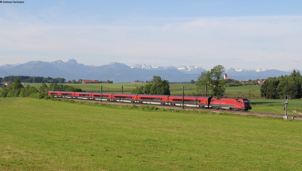 RJ 61 (München Hbf-Budapest-Keleti) mit Schublok 1116 220-3 bei Haus 28.5.13