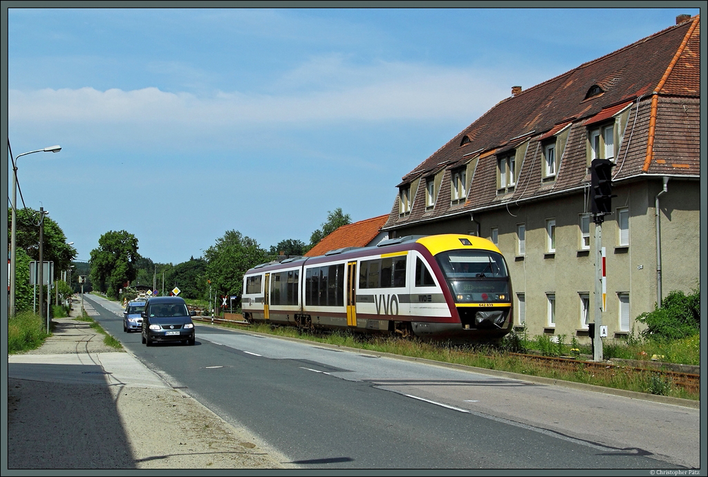 Südlich des Bahnhofs Ottendorf-Okrilla Nord rollt 642 339 der Städtebahn Sachsen gemächlich Richtung Dresden. Hier verläuft die Strecke direkt neben der Hauptstraße durch den Ort, zahlreiche kleine Bahnübergänge sind zu passieren. (17.06.2013)