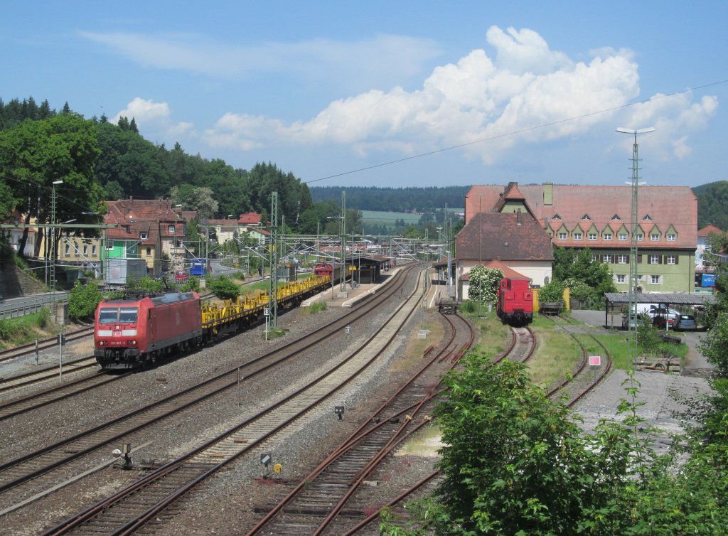 185 001-5 zieht am 18. Juni 2013 einen gemischten Güterzug durch Kronach in Richtung Lichtenfels.