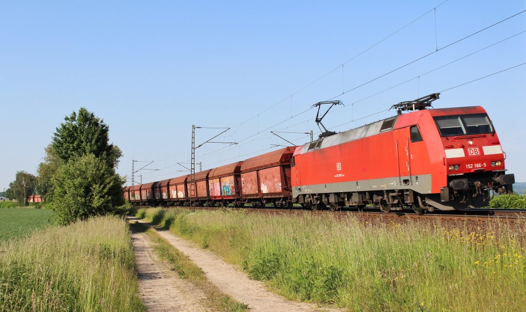 152-167 vor Leerzug mit zwei offenen Schüttgutwagentypen: Facs, sowie Fans (diese sowohl mit DB-Cargo als auch Railion Logo) am 15.6.13 auf der Rheinbahn (Baden) vor Oftersheim