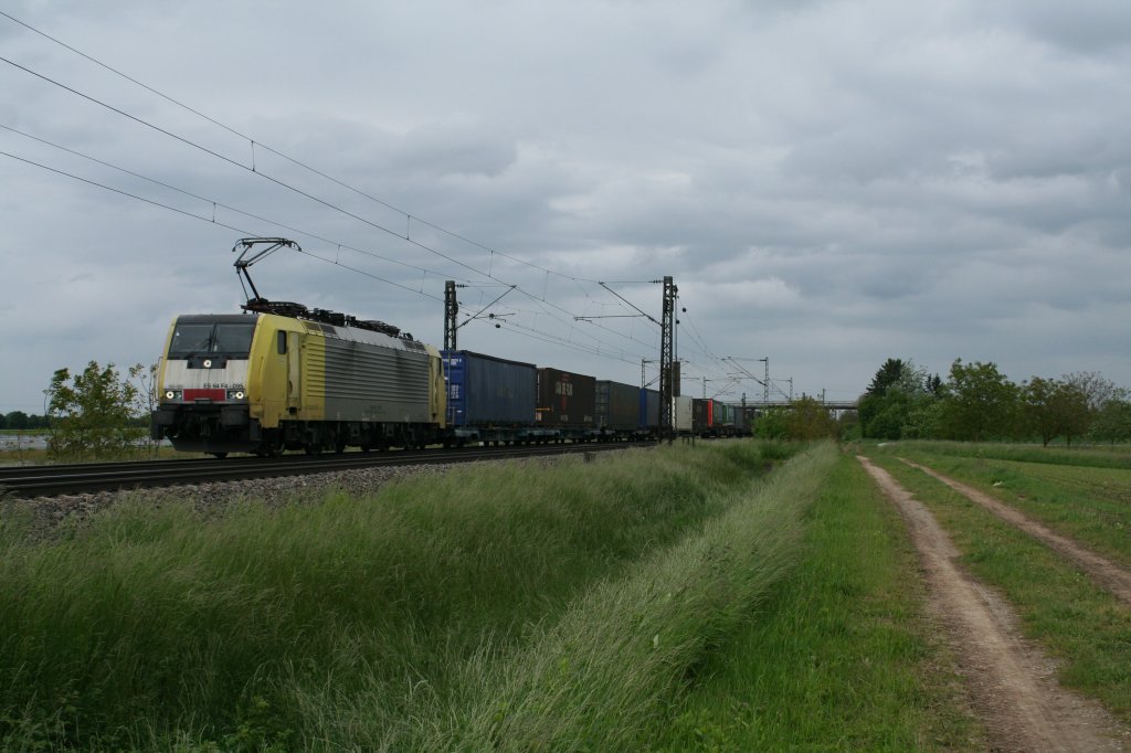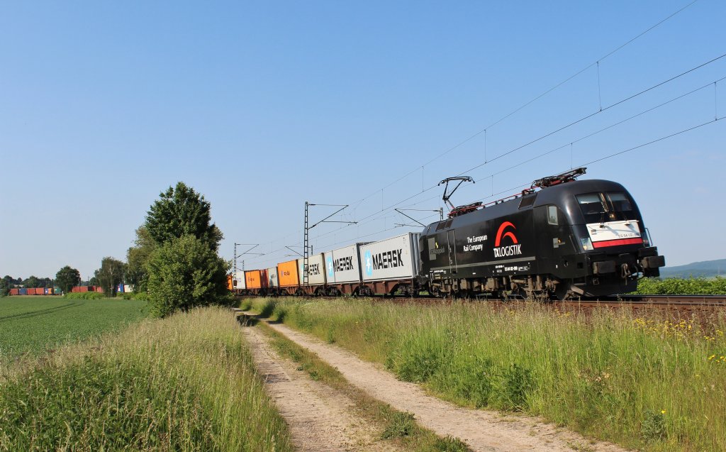 185 224 mit Containerzug. Interessant die zweite 185 mit gesenkten Stromabnehmern, also keine Doppeltraktion; am am 15.6.13 auf der Rheinbahn (Baden) vor Oftersheim