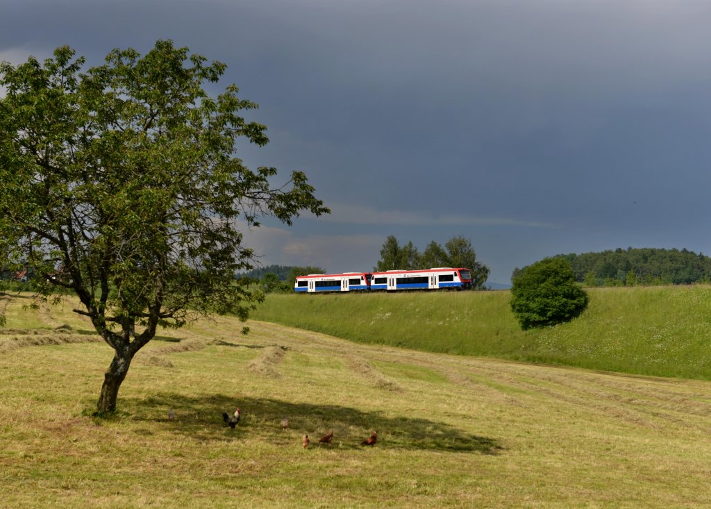 ODEG-Nahverkehrsdieseltriebwagen der BR 650 zu Gast auf der Münstertalbahn, hier am Haltepunkt Hof, am 9.Juni wurde die ca. 11Km lange Nebenbahn nach einjährigem Umbau und Elektrifizierung wieder in Betrieb genommen, Juni 2013