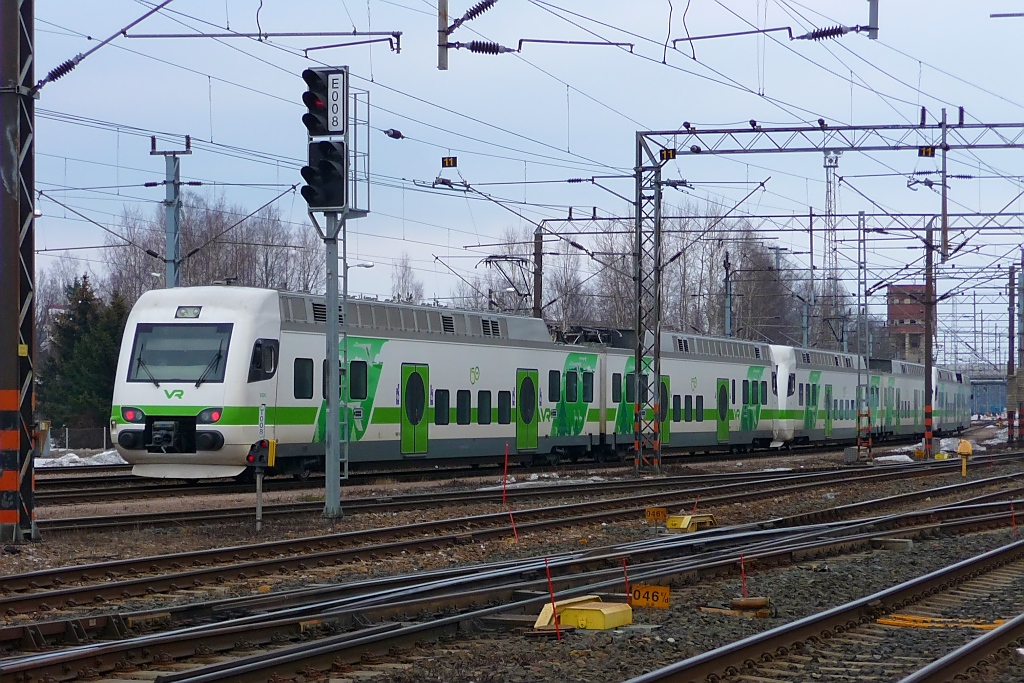 Drei Triebzüge der VR-Baurehe Sm4 warten auf Abfahrt in Riihimäki, 12.4.13