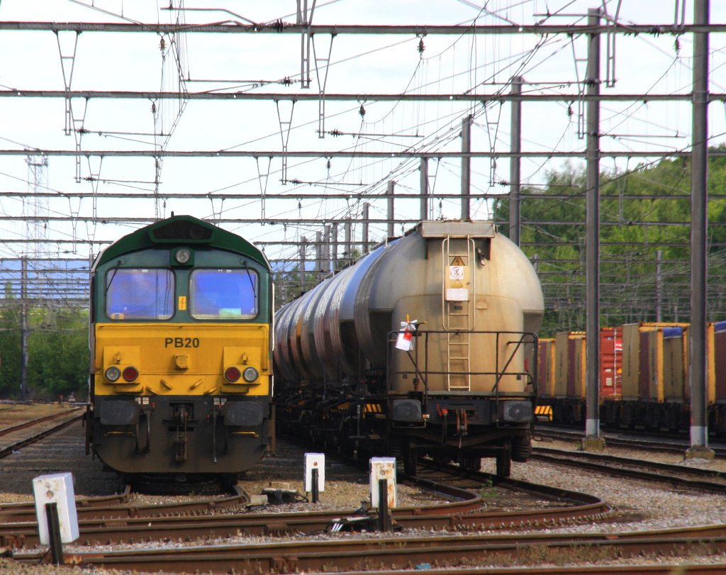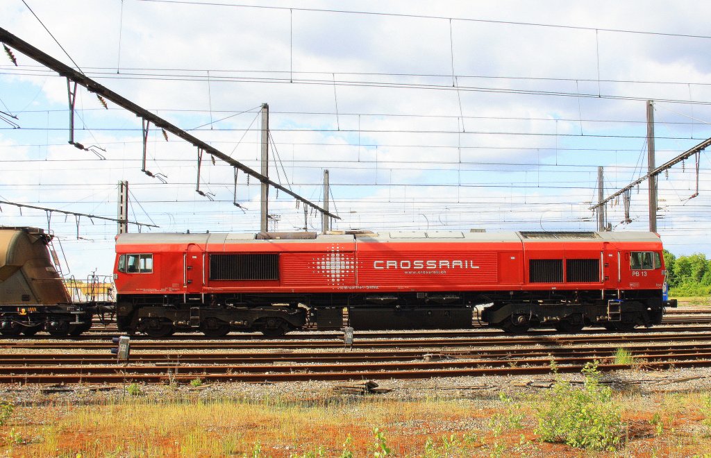 Die Class 66 PB14 von Railtraxx BVBA steht in Montzen-Gare(B) bei schönem Sonnenschein am 2.6.2013.