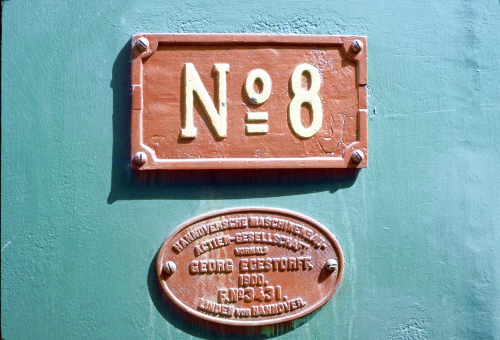 Luxemburg, Museumseisenbahn im Industrie- und Eisenbahnpark Fond-de-Gras. Die erste Dampflok Nummer 8 der Museumsbahn mit einem Personenzug. Die Personenwagen waren die dreiachsigen GCI (Grossraumwagen mit Personenübergangseinrichtung) der SNCB welche von 1890 bis 1966 im Einsatz waren. Die Museumseisenbahn benutzte sie von 1973 bis 2000. Ab 2004 dienten sie als Reservewagengarnitur. Scan eines Dias von August 1974.