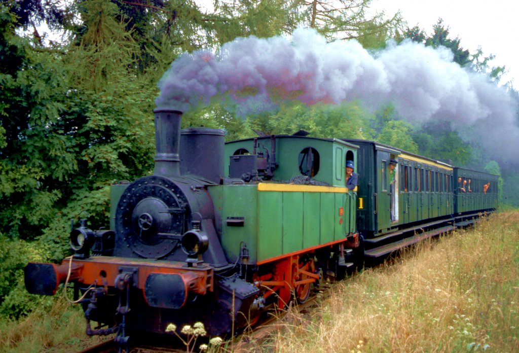 Luxemburg, Museumseisenbahn im Industrie- und Eisenbahnpark Fond-de-Gras. Die erste Dampflok Nummer 8 der Museumsbahn mit einem Personenzug auf dem Weg von Fond-de-Gras nach Fuusbësch. Die Personenwagen waren die dreiachsigen GCI (Grossraumwagen mit Personenübergangseinrichtung) der SNCB welche von 1890 bis 1966 im Einsatz waren. Die Museumseisenbahn benutzte sie von 1973 bis 2000. Ab 2004 dienten sie als Reservewagengarnitur. Scan eines Dias von August 1974.