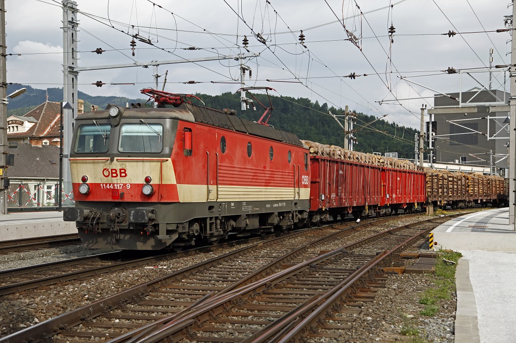 1144 117 mit der sogenannten Schachbrettlackierung am 22.06.2013 mit Güterzug in Bruck/Mur.