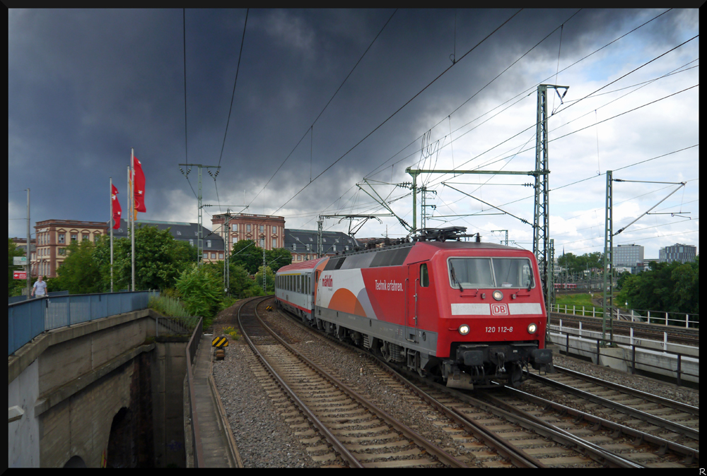 120 112-8 fährt bei warmen, eigentlich sonnigen Wetter mit dem IC 118 am Mannheimer Schloss vorbei. Die schwarzen giftigen Wolken stammen aus einem Großbrand aus einer ludwigshafener Lagerhalle für Styropor.