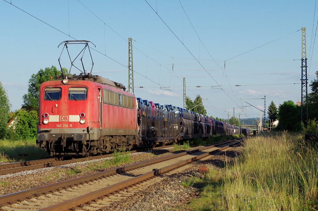 140 214 mit Autotransportwagenzug am 21.06.2013 in Neuses an der Regnitz.