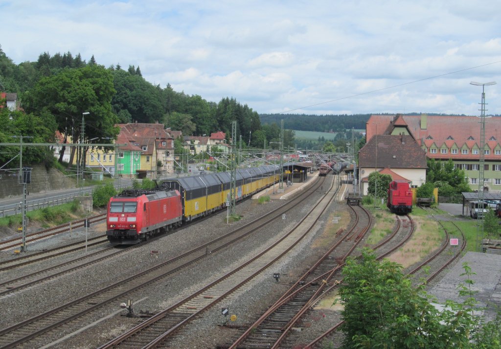 185 023-9 zieht am 22. Juni 2013 einen ARS-Altmannzug durch Kronach in Richtung Lichtenfels.