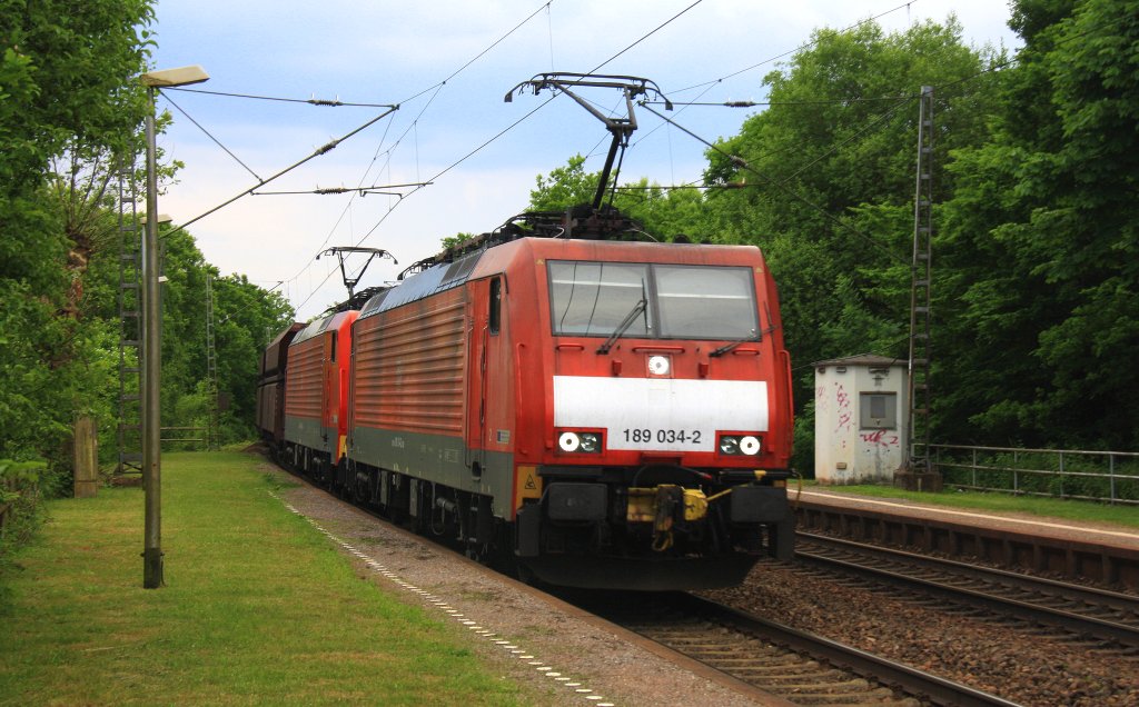 189 034-2 und 189 040-9 beide DB kommen durch Sehlem aus Richtung Trier-Ehrang und fahren in Richtung Koblenz mit einem langen Erzleerzug aus Dillingen(an der Saar) nach Rotterdam(NL) bei Sommerwetter mit Gewittergefahr am 8.6.2013.