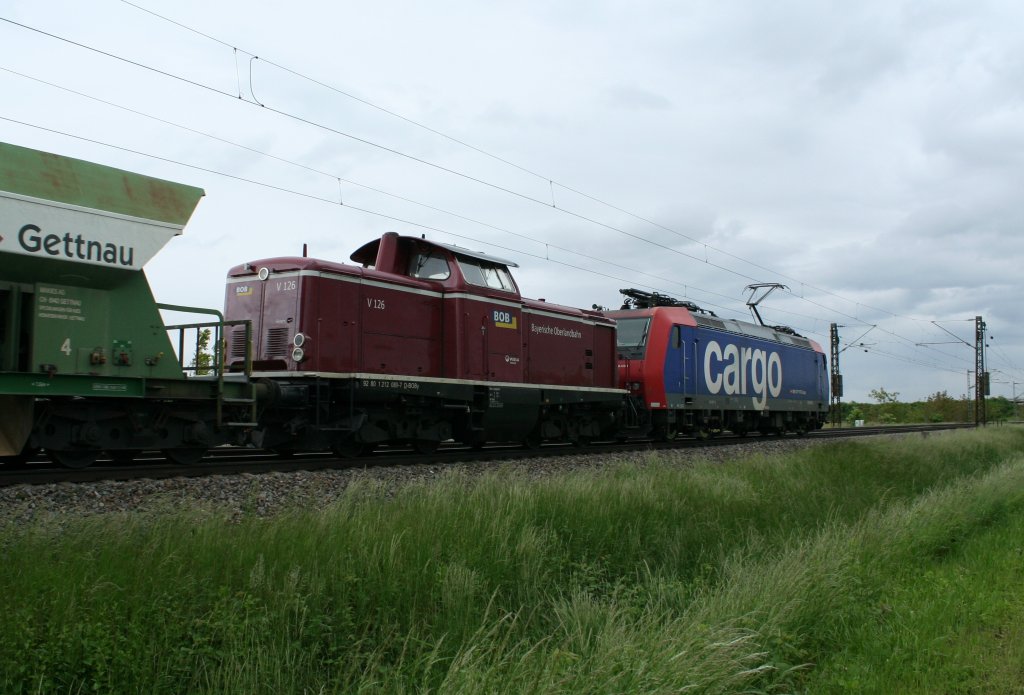 212 089-7 hinter 482 027-0 in einem Schotterzug, aufgenommen am 23.05.13 bei Hügelheim.