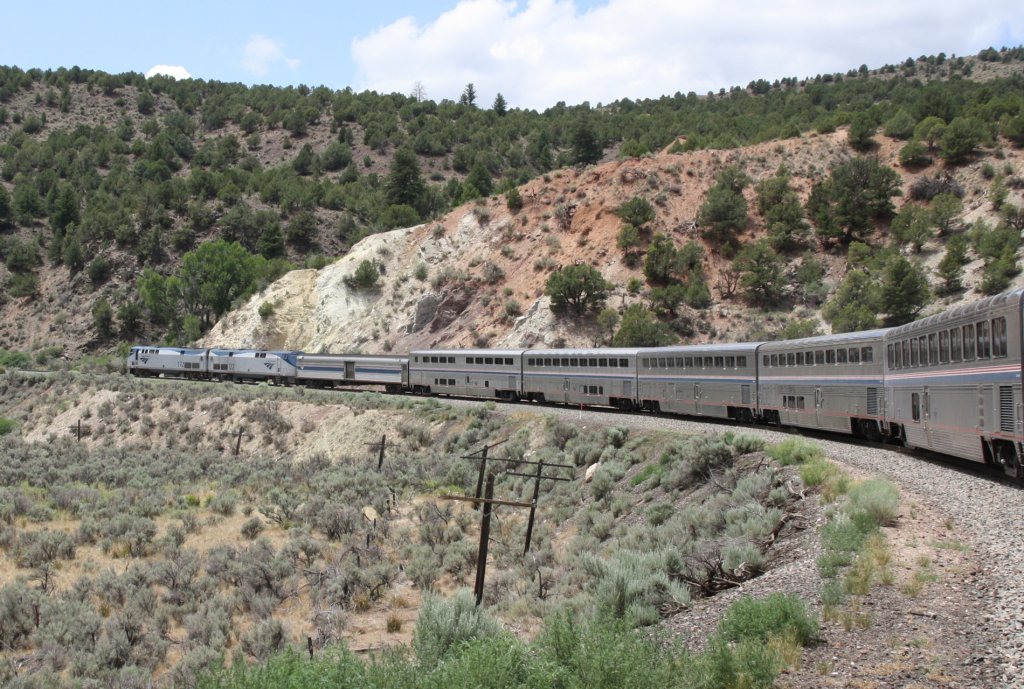 7.6.2012 Amtraks California Zephyr mit Genesis 172 und 122 auf einer Steigung zwischen Fraser und Glenwood Springs, CO.