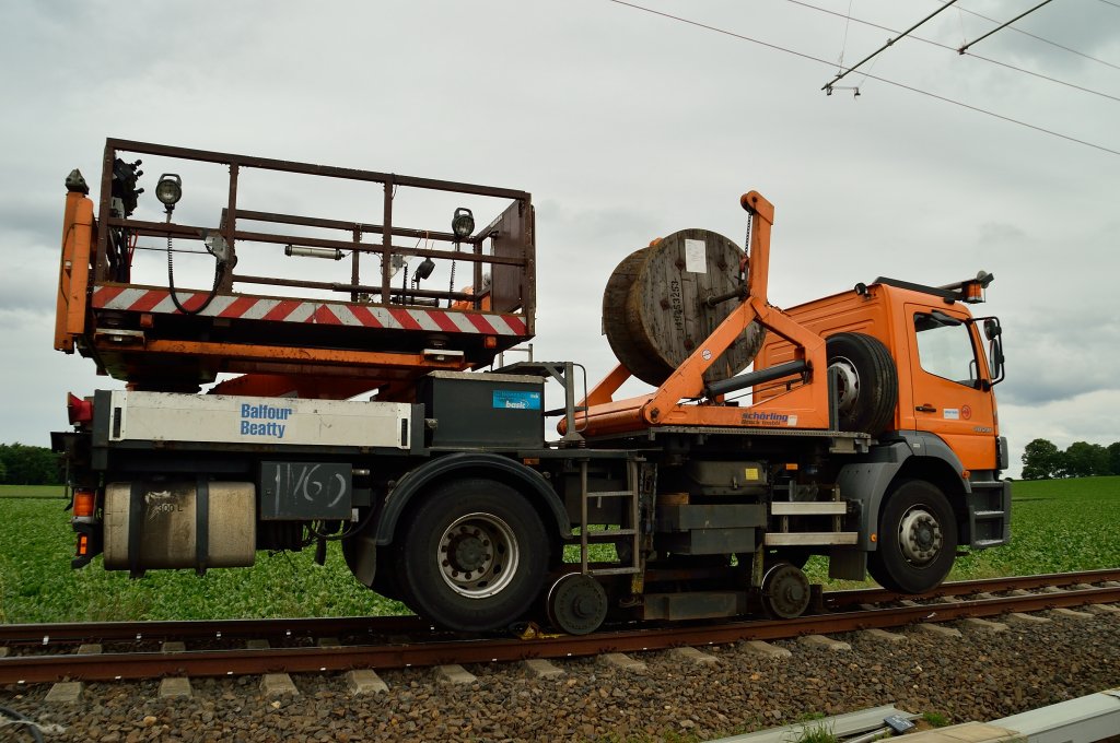 Beim Umbau der Kbs 456 Lindern-Heinsberg ist dieser MB 1828 der Firma Balfour Beatty im Einsatz, er ist für die Fahrdrahtaufhängung zuständig. 22.6.2013