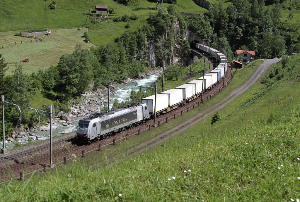 Die 186 104 "Flash Fire" mit Güterzug in der Wattinger Kurve bei Wassen am 13.06.2013